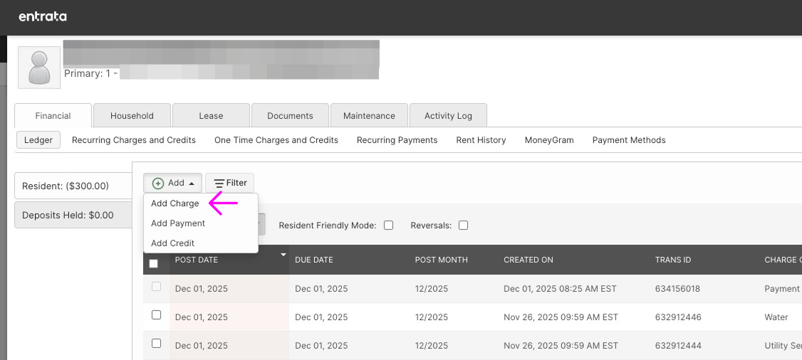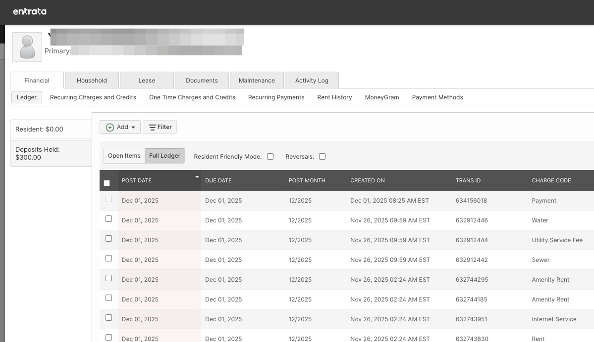 Below are instructions for how to remove the security deposit charge from a resident's ledger in Entrata and then add a charge to show those funds are being transferred to Whale. This should be done before sending the funds to Whale.