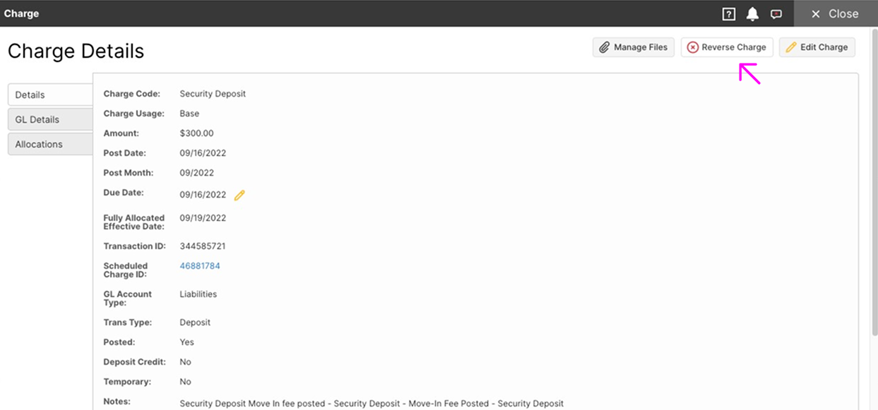 Click "Reverse Charge" to remove the charge for the security deposit as it will now be held in Whale.