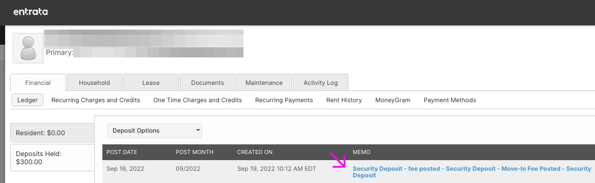 Find the security deposit transaction and click the blue hyperlink to open the transaction.