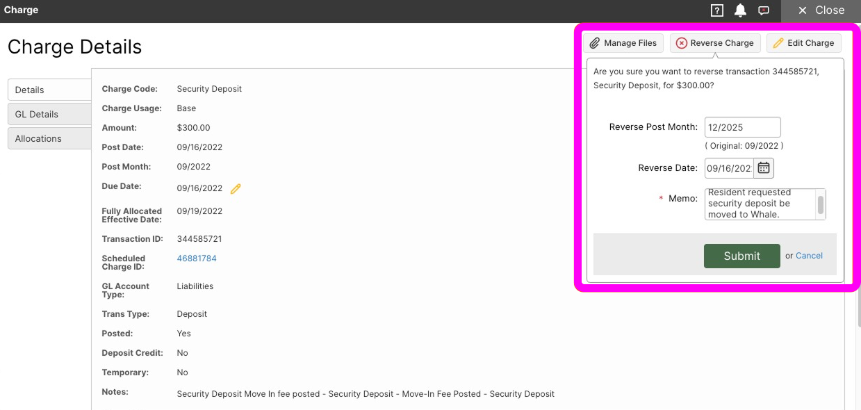 Under Memo enter that the Resident requested security deposit be moved to Whale with the Reference code listed on the Flip Transfer request. Click "Submit".