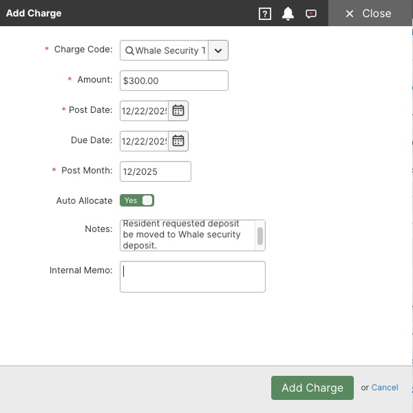 - Under notes, enter "Resident requested deposit be moved to Whale security deposit.