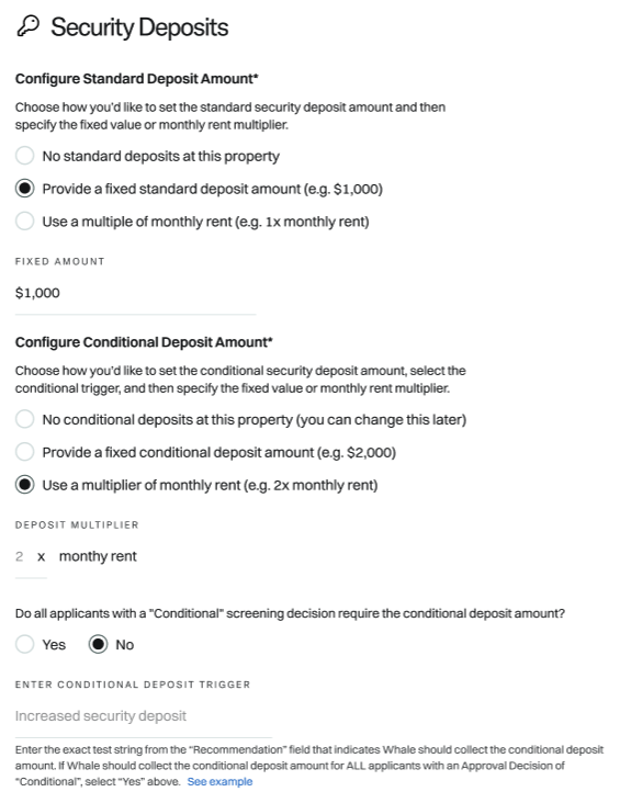 Whale uses an applicant's screening result to determine if a standard or conditional deposit amount should be requested. Whale then uses these settings to determine the correct deposit amount.
