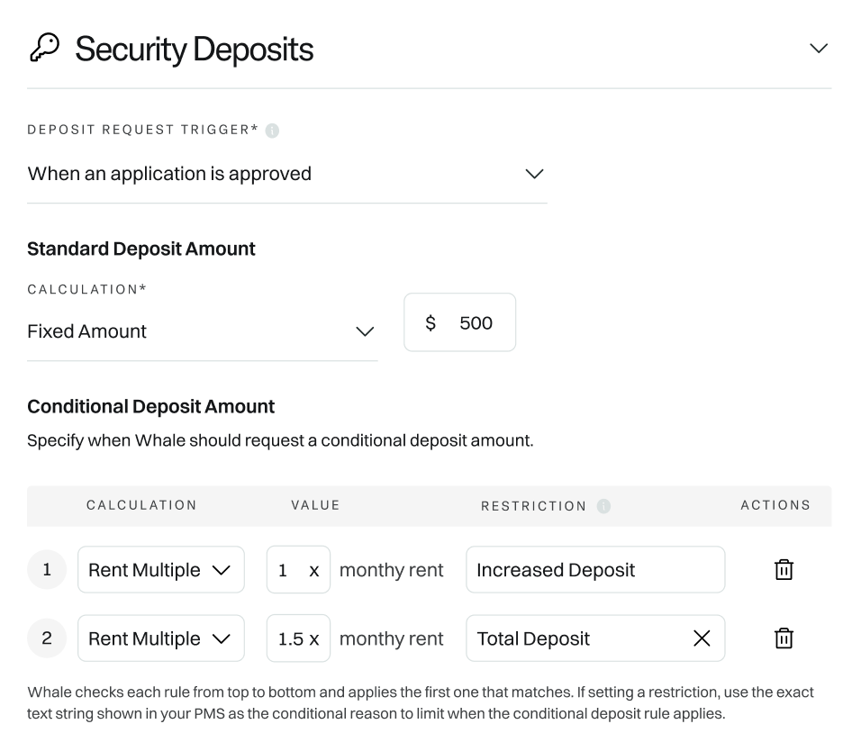 - Set the deposit amount (it must be a fixed amount since Whale might not know the monthly rent at the point of application submission).